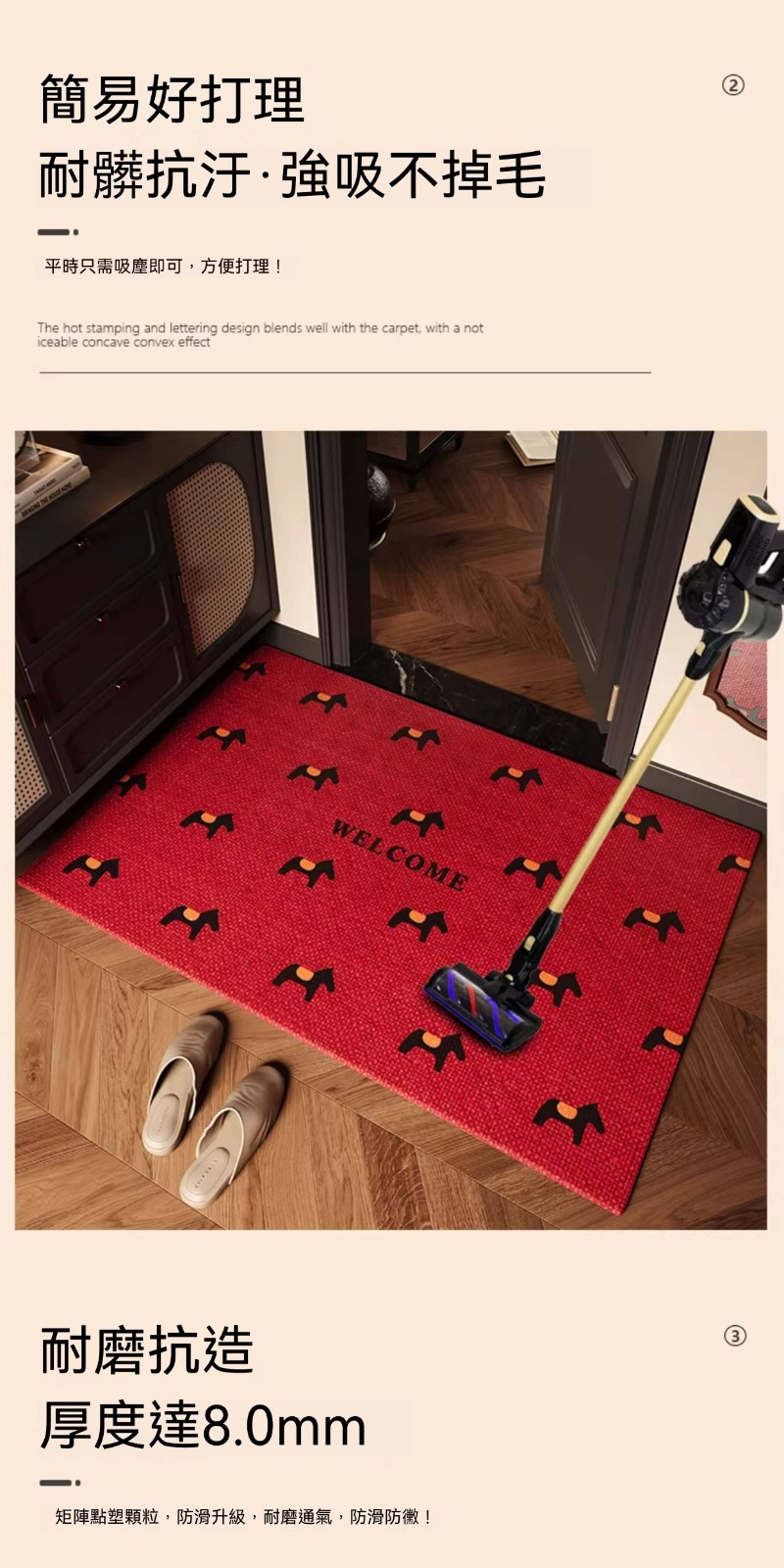 ✨專為入戶門、大門口設計,以喜慶的紅色搭配吉祥的駿馬圖案,為家居增添一份好運與活力。✨採用高品質圈絨材質,耐磨耐髒,一踩即淨;底部防滑設計,穩固不位移,守護家人進出的安全。無論是自用還是送禮,都是為家門增添溫馨與品味的最佳選擇。✨
